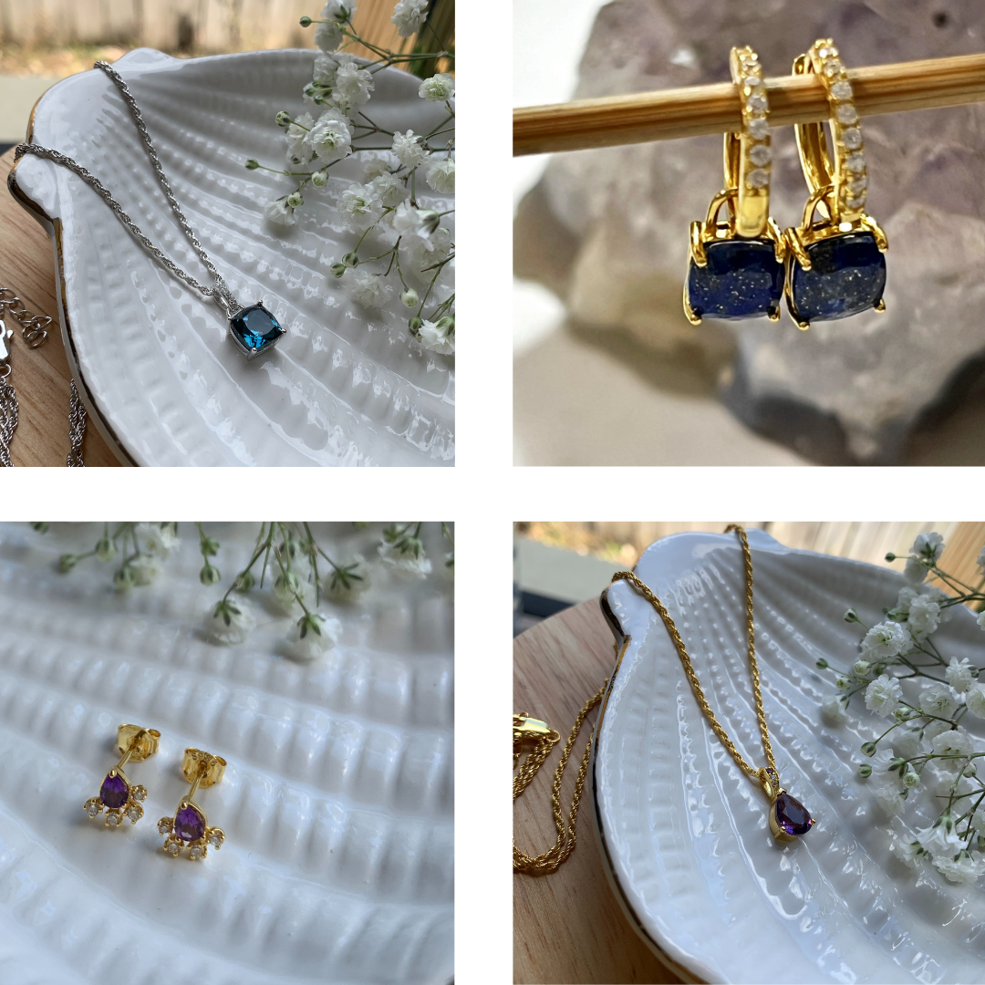 Each piece is beautifully crafted from 18K gold-plated sterling silver and set with cushion-cut natural birthstones or crystals of your choice. The pendants and earrings are designed to amplify your aura and connect you to your inner light.